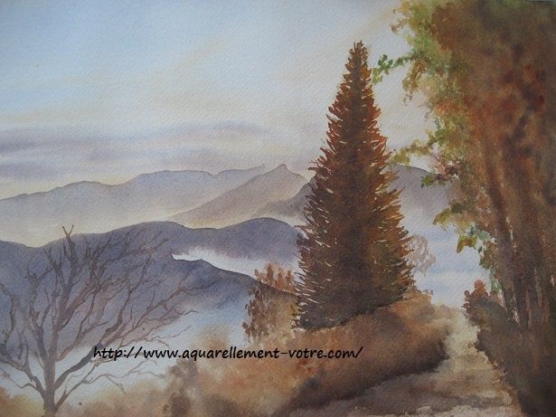 La photo est si belle que c'est forcément difficile de rendre sa lumière à la fois douce et intense sur une aquarelle. Tes effets de brume sont superbes. Par contre, moi qui n'y connais rien par rapport à toi :) j'aurai ajouté un peu plus de jaune dans le ciel pour le rendre plus lumineux...bisous et un samedi tout doux