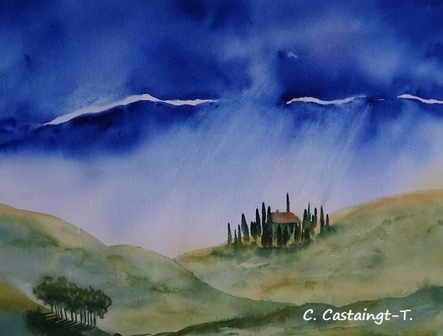 J'aime beaucoup le contraste entre la moitié inférieure douce et la moitié supérieure avec ce ciel déchiré ! Une aquarelle qui ne laisse pas indiffèrent, la partie sombre des arbres au premier plan équilibre l'ensemble, bravo ! Je t'embrasse, Maggy