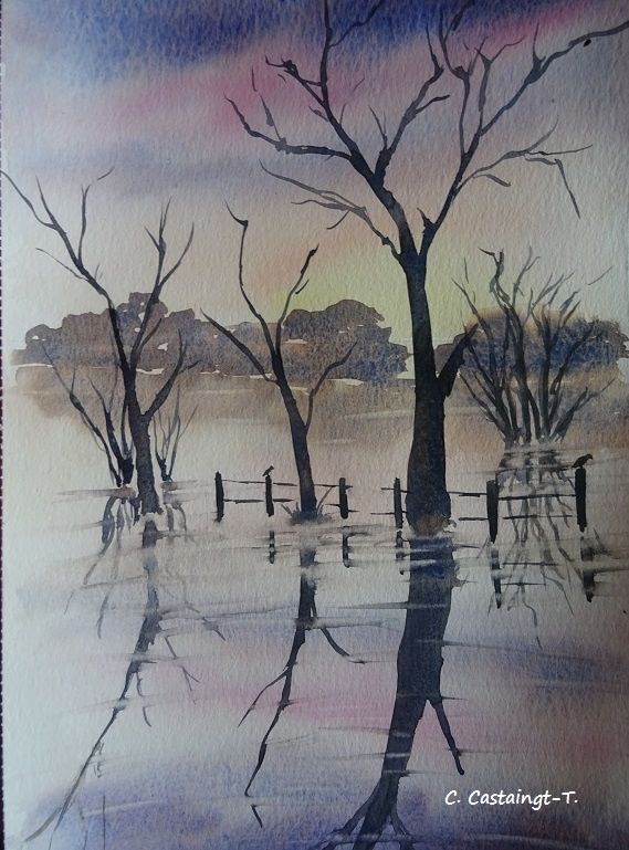 Ah comme j'aimerais être capable de faire cela ! Votre aquarelle reflète bien l'impression de désolation des paysages inondés et la lumière grisée de ces journées de janvier.