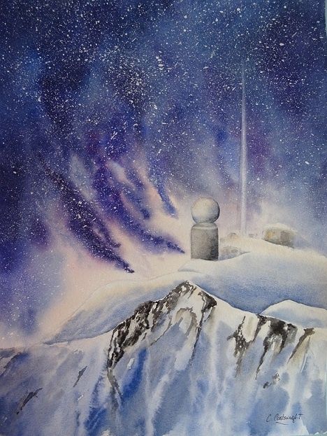 dans le cadre du 20ème concours / exposition de Ste Marie de Campan, j'expose 3 aquarelles, une assez classique (à voir ICI), une plus originale (à mon gout - voirICI) et voici la dernière : l'observtaoire du Pic du Midi eneigé sous la voie lactée.