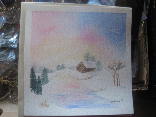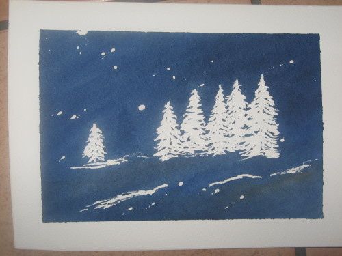 Cartes de voeux à l'aquarelle : petite maison dans la neige - sapins blancs dec 2013 |