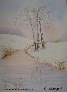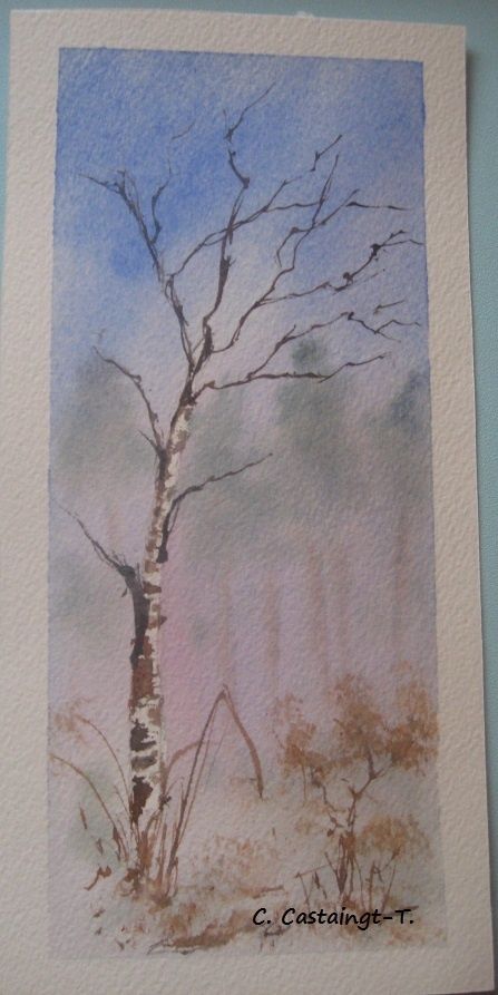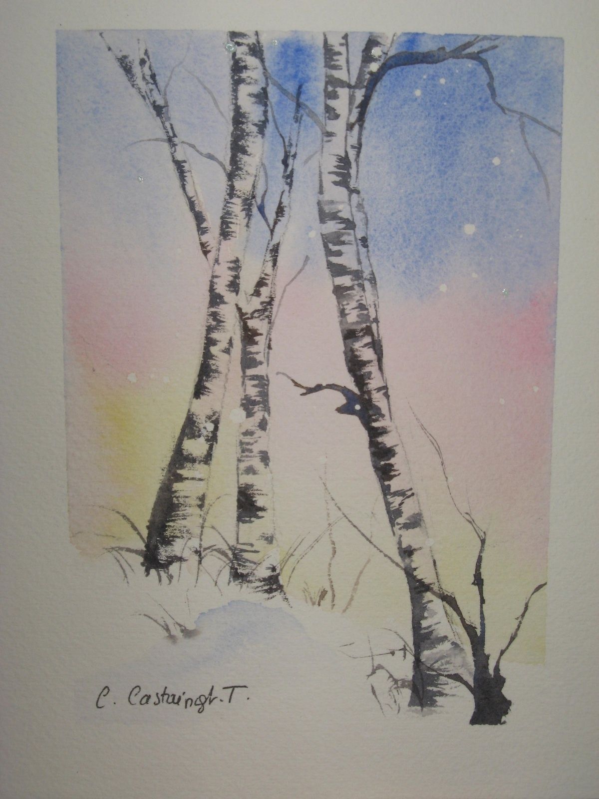 Cartes de voeux à l'aquarelle : les bouleaux dans la neige dec 2014 |