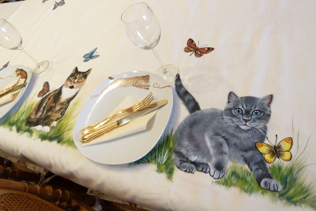 les chats sont venus décorer une nappe unique grace aux pinceaux et surtout le talent de Laurence